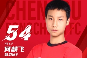 何麟飛,2009年1月19日出生于四川成都 ,身高172cm,體重60kg,司職進(jìn)攻型中場(chǎng)。此前,何麟飛代表成都蓉城足球俱樂部U16梯隊(duì)出場(chǎng)60場(chǎng),貢獻(xiàn)13粒進(jìn)球、18次助攻,在傳射方面都展現(xiàn)出一定的特點(diǎn)。何麟飛出自成都本土青訓(xùn),具有較好的領(lǐng)導(dǎo)能力,在多場(chǎng)比賽中擔(dān)任球隊(duì)隊(duì)長,并多次獲得單場(chǎng)最佳球員。何麟飛曾帶領(lǐng)球隊(duì)獲得2022年省錦標(biāo)賽冠軍、2023年省運(yùn)會(huì)冠軍、2024年中國足協(xié)青少年足球錦標(biāo)賽季軍、2024年第四屆貢嘎杯冠軍以及2024年省錦標(biāo)賽冠軍。2024年,何麟飛曾入選U15男足國家隊(duì)第四期集訓(xùn),并隨球隊(duì)赴韓國進(jìn)行拉練。何麟飛的到來,將為成都蓉城B隊(duì)中前場(chǎng)提供有力的支持,注入更強(qiáng)大的戰(zhàn)斗力。