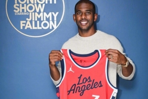 日前,保羅帶著3號(hào)快船球衣亮相《吉米今夜秀》(The Tonight Show),并與主持人一同合影。
