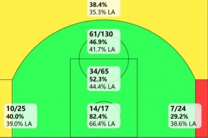 美媒曬出了保羅上賽季的投籃熱圖,他上賽季在三分線內(nèi)的各個區(qū)域命中率都高于聯(lián)盟平均水平,82場比賽籃下僅出手17次,但命中率14個,命中率高達(dá)82.4%,遠(yuǎn)高于聯(lián)盟平均的66.4%。