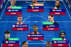 前鋒:埃基蒂克(7500萬)、伊薩克(紐卡,1.2億)、薩拉赫(5000萬)