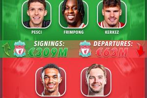 1-利物浦:轉(zhuǎn)會支出3.0868億歐,轉(zhuǎn)會收入6330萬歐,凈支出2.4538億歐