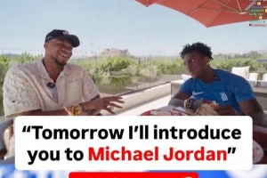 直播中,字母哥提到自己第二天要去見喬丹,問甲亢哥想不想去。甲亢哥說想去,然后字母哥說:“但你可不敢朝著喬丹(像你平時一樣)瞎嚷嚷,喬丹會笑話你的?!?/p>