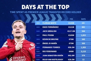 體育資訊7月26日訊 德國轉(zhuǎn)會市場列出了英超歷史標王的保持時間,其中費迪南德4600萬歐保持3115天最長,目前的標王為維爾茨,他的轉(zhuǎn)會費為1.25億歐元。