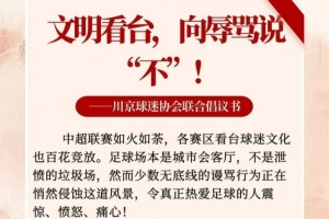 體育資訊7月26日訊 今晚,中超聯(lián)賽第18輪,成都蓉城將在主場對陣北京國安。賽前,川京球迷協(xié)會(huì)聯(lián)合倡議書:文明看臺(tái),向謾罵說“不”!