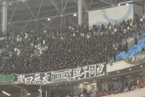 賽后,兩隊(duì)球員相互致意期間,看臺(tái)一角的國(guó)安球迷集體高呼:“丟人現(xiàn)眼!”