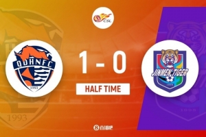 傷停補(bǔ)時(shí)8分鐘。上半場(chǎng)比賽結(jié)束,青島海牛1-0天津津門(mén)虎。