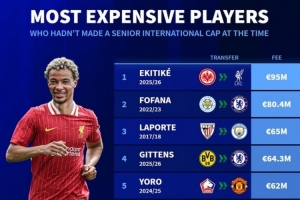 體育資訊7月28日訊 利物浦在上周已經(jīng)官宣以9500萬歐元簽下?;倏?,而他至今尚未為法國隊(duì)出戰(zhàn)。《轉(zhuǎn)會(huì)市場(chǎng)》也統(tǒng)計(jì)了那些在加盟時(shí)仍未能為成年國家隊(duì)出場(chǎng)的歷史最貴引援。