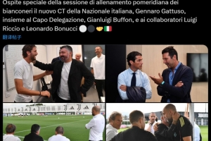 意大利新帥加圖索及領(lǐng)隊(duì)布馮、助教博努奇和里奇奧在今日下午造訪了尤文訓(xùn)練基地,和俱樂部上下進(jìn)行了友好交流。