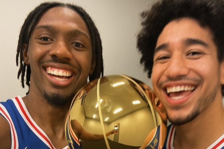 體育資訊07月28日訊 今日,76人后衛(wèi)賈里德-麥凱恩在個人社交媒體上放出了一張他與隊友泰瑞斯-馬克西的AI奪冠合照。