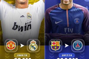 2-內(nèi)馬爾,2017年巴薩→巴黎,2.22億歐,通脹后2.8億歐