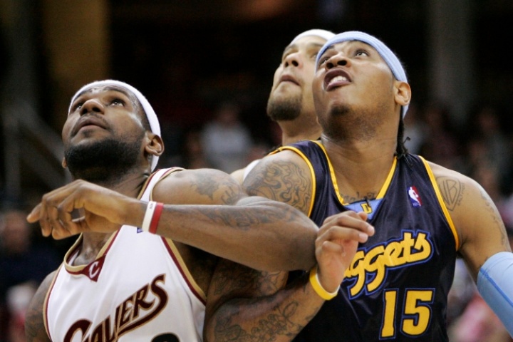 2003-04賽季,安東尼場(chǎng)均21分6.1籃板2.8助攻,掘金隊(duì)最終43勝39負(fù)排名西部第8進(jìn)入季后賽,詹姆斯場(chǎng)均20.9分5.5籃板5.9助攻,騎士隊(duì)最終35勝47負(fù)未能進(jìn)入季后賽。2003年最佳新秀評(píng)選,詹姆斯得分508分排名第一,安東尼得分403分排名第二。