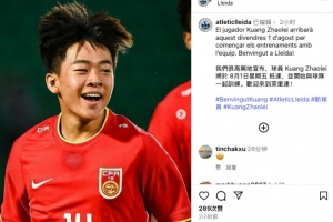 今日該俱樂部在社媒曬出鄺兆鐳身穿國少球衣的照片,并用西語和中文宣布球員將于8月1日抵達(dá)球隊,并將和一線隊訓(xùn)練比賽。萊里達(dá)競技公告寫道: