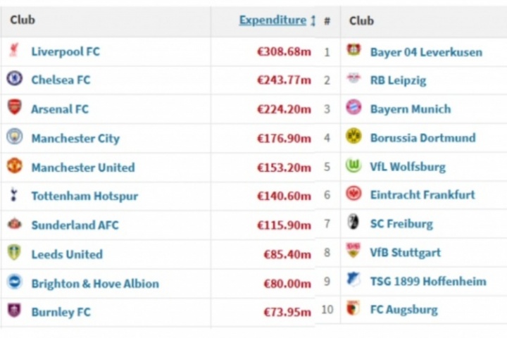 英超夏窗支出排行榜:(截止到7月30日)