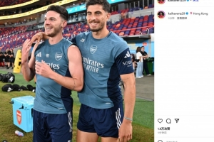 哈弗茨曬出了他和賴斯在賽后勾肩搭背的合照,兩人都顯得非常開心,并配文:“??中國香港”。