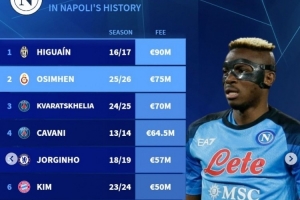 體育資訊7月31日訊 奧斯梅恩轉(zhuǎn)會加拉塔薩雷只待官宣,《轉(zhuǎn)會市場》也統(tǒng)計(jì)了那不勒斯隊(duì)史最貴賣人情況,伊瓜因仍居首。