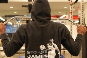 詹姆斯曬出了一組個(gè)人訓(xùn)練照,在其中多張照片中,他身穿印有小兒子布萊斯形象的定制連帽衫。