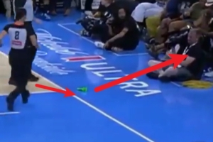 比賽期間,有球迷再次往場內(nèi)扔了一個綠色的假陽具,裁判當即中斷比賽,女裁判伸腳將假陽具一腳踢飛。