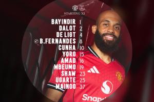 曼聯(lián)首發(fā):1-巴因迪爾、2-達(dá)洛特、4-德里赫特、23-盧克-肖、15-約羅、25-烏加特、8-B費(fèi)、10-庫尼亞、37-梅努、16-阿瑪?shù)隆?9-姆貝莫