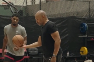 亨德森接受“老魚”費(fèi)舍爾特訓(xùn)指導(dǎo),費(fèi)舍爾直接脫掉球鞋,給亨德森講解投籃時的腳步姿勢。