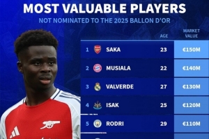 體育資訊8月8日訊 2025年金球獎(jiǎng)候選名單出爐,德國轉(zhuǎn)會(huì)市場統(tǒng)計(jì)了未獲提名球員的身價(jià),并列出榜單,薩卡、穆西亞拉、巴爾韋德前三位。
