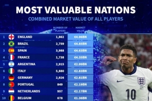 體育資訊7月12日訊 《轉(zhuǎn)會市場》統(tǒng)計了當前各國球員的總身價情況,英格蘭、巴西、西班牙和法國位列第一集團。