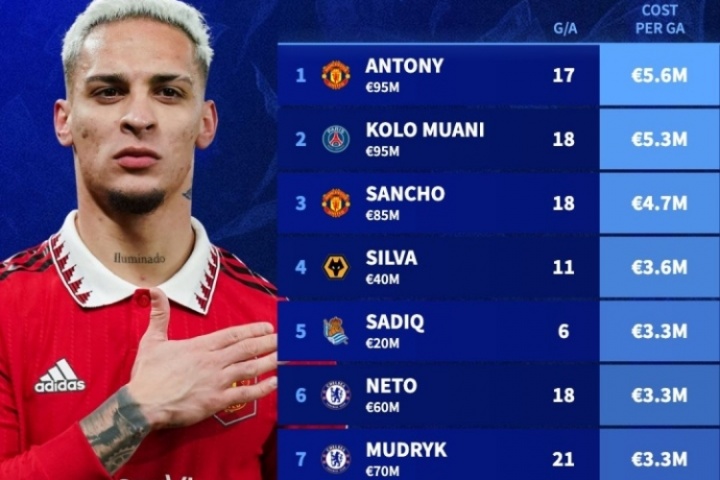 體育資訊08月08日訊 今日德轉(zhuǎn)盤(pán)點(diǎn)了參與進(jìn)球花費(fèi)轉(zhuǎn)會(huì)費(fèi)最多的球員,其中安東尼以560萬(wàn)歐每球,位列榜首,前十曼聯(lián)、切爾西各占3席。