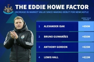 德轉(zhuǎn)列近年新援加盟紐卡后升值榜:歐元