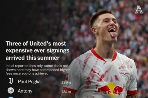 體育資訊8月9日訊 媒體TA統(tǒng)計(jì)了曼聯(lián)引援的轉(zhuǎn)會(huì)費(fèi),并列出榜單,博格巴8900萬(wàn)英鎊居首,安東尼次席,前10名球員中有3人是在今夏加盟。