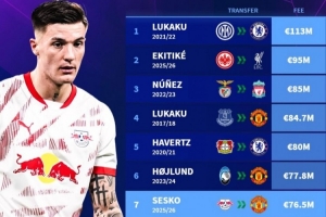 7、塞斯科(2025-26賽季RB萊比錫→曼聯(lián)),7650萬歐元