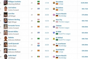 1.庫蒂尼奧 25歲 17/18賽季 賣給巴薩 1.35億歐