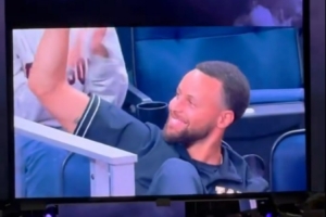 比賽期間,大屏幕找到了勇士當家球星庫里,坐在妻子阿耶莎身邊的庫里高興得像個孩子,揮手向觀眾示意。