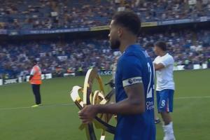 賽前切爾西在場(chǎng)地中央展示獎(jiǎng)杯↓