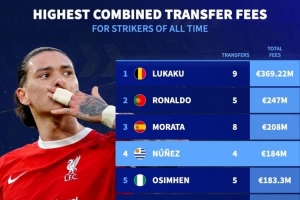 體育資訊8月11日訊 德國轉(zhuǎn)會市場統(tǒng)計(jì)了前鋒累計(jì)轉(zhuǎn)會費(fèi),并列出榜單,盧卡庫3.6922億歐居首,C羅、莫拉塔、努涅斯排名前四。
