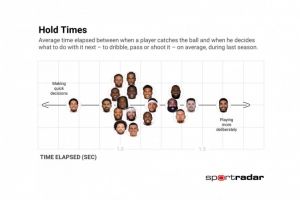 體育資訊8月11日訊?數(shù)據(jù)專家Todd Whitehead統(tǒng)計(jì)了上賽季,進(jìn)攻發(fā)起者在接到球之后,做出下一步行動(運(yùn)球、傳球或投籃)所用的平均時(shí)間,具體如圖。