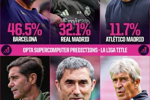 ■以下是Opta超級計算機預測新賽季西甲冠軍歸屬概率: