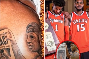 2003年,卡梅隆-安東尼率領(lǐng)雪城大學(xué)奪得NCAA總冠軍,基揚將安東尼奪冠后的經(jīng)典海報中的“CHAMPS(冠軍)”字樣改成了“LEGACY(傳承)”,并紋在了自己的左臂。