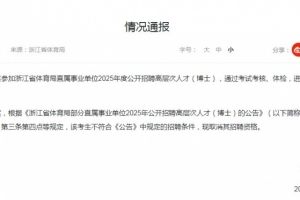 經(jīng)考察核實,根據(jù)《浙江省體育局部分直屬事業(yè)單位2025年公開招聘高層次人才(博士)的公告》(以下簡稱《公告》)第二條第二點、第三條第四點等規(guī)定,該考生不符合《公告》中規(guī)定的招聘條件,現(xiàn)取消其招聘資格。