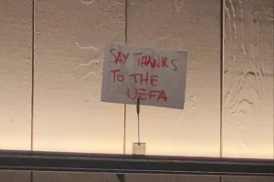 在原本放置烈酒的架子處,貼著一張紙條,解釋了為什么只能賣啤酒。紙條用鮮紅色的字寫著:“感謝歐足聯(lián)”,下面還貼著另一張寫著“這不是我們的錯(cuò)”。