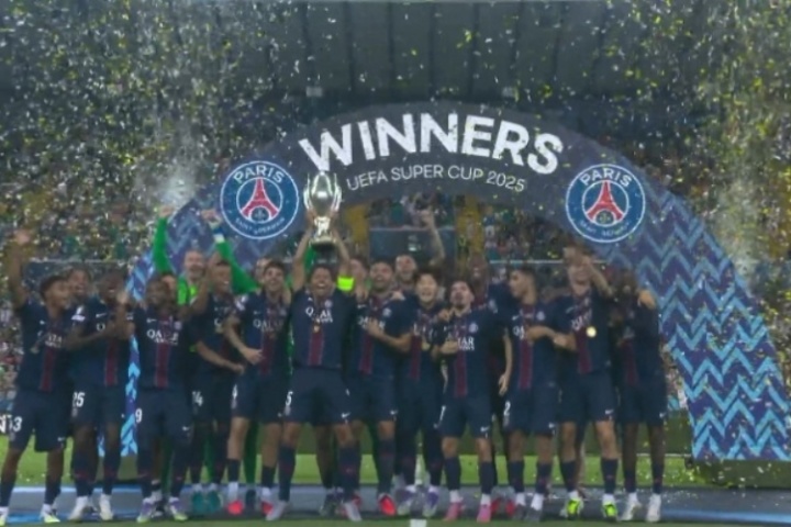 體育資訊08月14日訊 今日歐洲超級杯決賽,上賽季歐冠冠軍巴黎點球大戰(zhàn)6-5戰(zhàn)勝歐聯(lián)冠軍熱刺,隊史首次奪得本賽事冠軍。賽后馬爾基尼奧斯率隊捧起冠軍獎杯!
