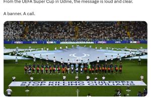 歐足聯(lián)官方在社交平臺上配文寫道:“來自烏迪內(nèi)的歐洲超級杯現(xiàn)場,這則信息響亮且清晰,一面標(biāo)語,一次號召。”這一標(biāo)語并沒有明確針對的對象,但歐足聯(lián)在活動期間還邀請了兩名來自巴勒斯坦的難民兒童參加頒獎儀式,指向性十分明確。
