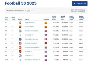 Brand Finance2025全球最具價(jià)值足球品牌↓