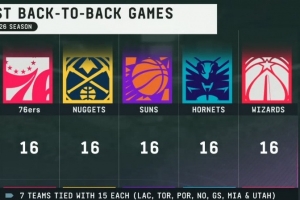 下賽季背靠背次數(shù)16次的球隊(duì):76人、掘金、太陽(yáng)、黃蜂、奇才