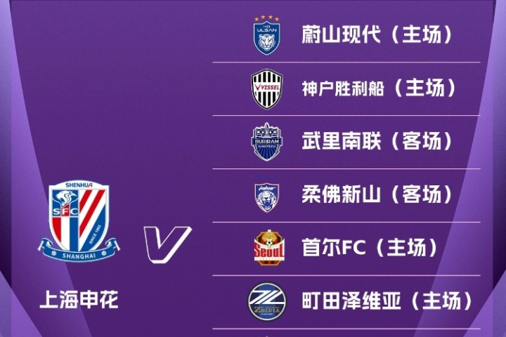 上海申花對陣:主場vs蔚山HD、主場vs神戶勝利船、客場vs武里南聯(lián)、客場vs柔佛新山、主場vs首爾FC、主場vs町田澤維亞、客場vs廣島三箭、客場vs江原FC
