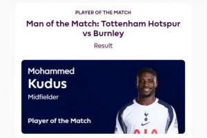 此役,熱刺夏窗新援庫杜斯首發(fā)出戰(zhàn),在第85分鐘被替換下場,送出兩記助攻,球員以43%的得票率當選英超官方全場最佳球員。