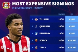 體育資訊7月12日訊 埃因霍溫中場蒂爾曼已經(jīng)官宣轉(zhuǎn)會勒沃庫森,《轉(zhuǎn)會市場》統(tǒng)計(jì)顯示他也并列為藥廠隊(duì)史標(biāo)王。