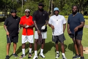 詹姆斯近日在波多黎各度假,他曬出了和幾位好友打高爾夫的合影,并寫道:“外面實在是太熱了???!哈哈”