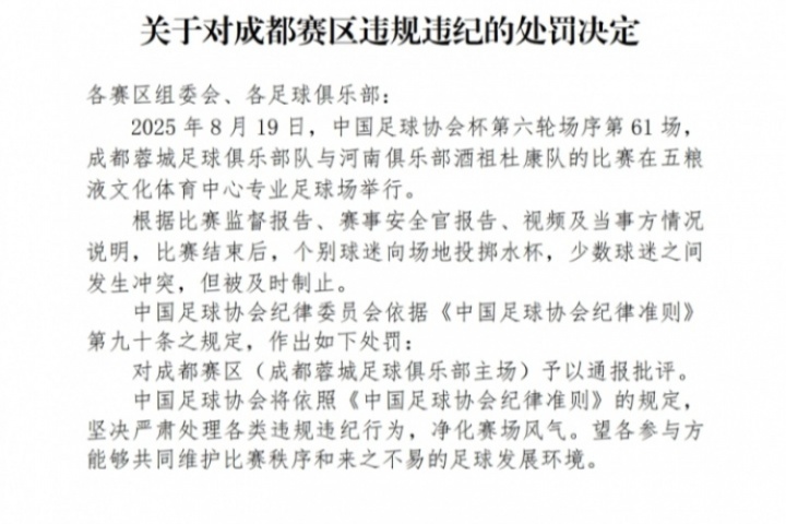 ?對成都賽區(qū)(成都蓉城足球俱樂部主場)予以通報批評。??