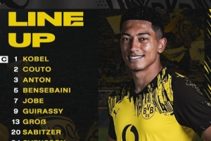 多特首發(fā):1-科貝爾、39-菲利波-馬內、3-安東、5-本塞拜尼、2-揚-庫托、13-格羅斯、20-薩比策、7-小貝林厄姆、24-斯文松、9-吉拉西、27-阿德耶米