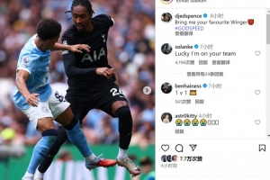 此役熱刺邊衛(wèi)斯賓塞踢滿(mǎn)全場(chǎng),幫助球隊(duì)取勝,賽后他在社交媒體上曬出比賽照片,并配文:“讓你們最喜歡的邊鋒放馬過(guò)來(lái)!”展現(xiàn)自己不懼對(duì)抗的自信。