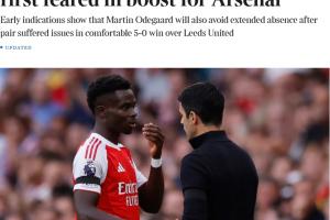 在昨日英超阿森納5-0擊敗利茲聯(lián)的比賽中,薩卡和厄德高雙雙因傷離場,引發(fā)眾多槍迷擔(dān)憂。主帥阿爾特塔在賽后曾表示,薩卡的傷情可能“不樂觀”。